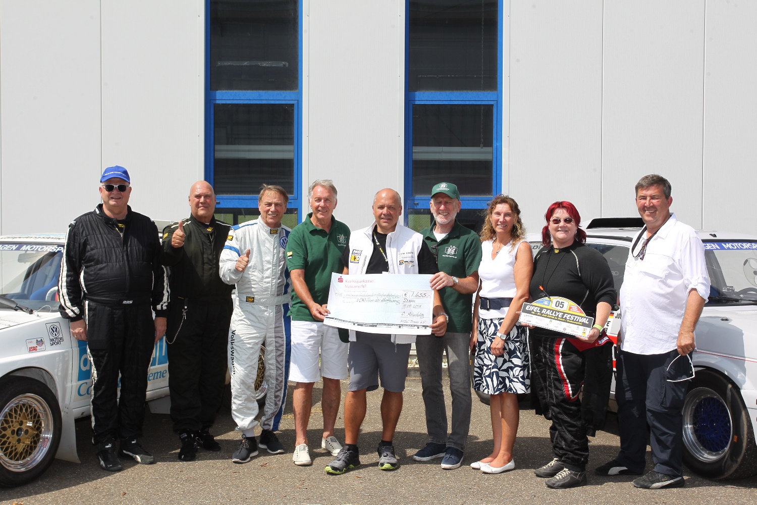 Es hat schon Tradition beim Eifel Rallye Festival, dass Mitfahrten bei prominenten Piloten in ganz speziellen Fahrzeugen für einen gutenZweck ersteigert werden. Diesmal hatten der Schweizer François-Xavier Fasel die Mitfahrt im VW Golf Bi-Motor 1986 von Wolf-Dieter Ihle und die Saarländerin Isabelle Brack eine Mitfahrt im VW Bimotor1987 ersteigert. Beide Fahrzeuge pilotierte dabei Ex-Europameister Jochi Kleint, der auch bei den damaligen Einsätzen am Pikes Peak am Steuer saß.Der Spendenbetrag von Fasel wurde dabei vom Fahrzeugeigner Ihle verdoppelt. Insgesamt kamen so 1.655 Euro für die Vortour der Hoffnung zusammen, die sich seit 23 Jahren für krebskranke Kinder einsetzt. Die Vortour der Hoffnung macht am 6. August in Daun Station, „aus allen 38 Ortsgemeinden der Verbandsgemeinde Daun beteiligen sich Vereine und Verbände“, war Doris Siken, die in der VG diese Aktivitäten koordiniert, begeistert. „Diese Spende des MSC Daun mit seinem Eifel Rallye Festival ist ein Super-Beitrag dazu“. Auch Jürgen Grünwald, Tour-Vorsitzender freute sich, „wir radeln in der Region um Spenden für krebskranke Kinder zu sammeln, das hier ist ein richtig cooler Betrag.“