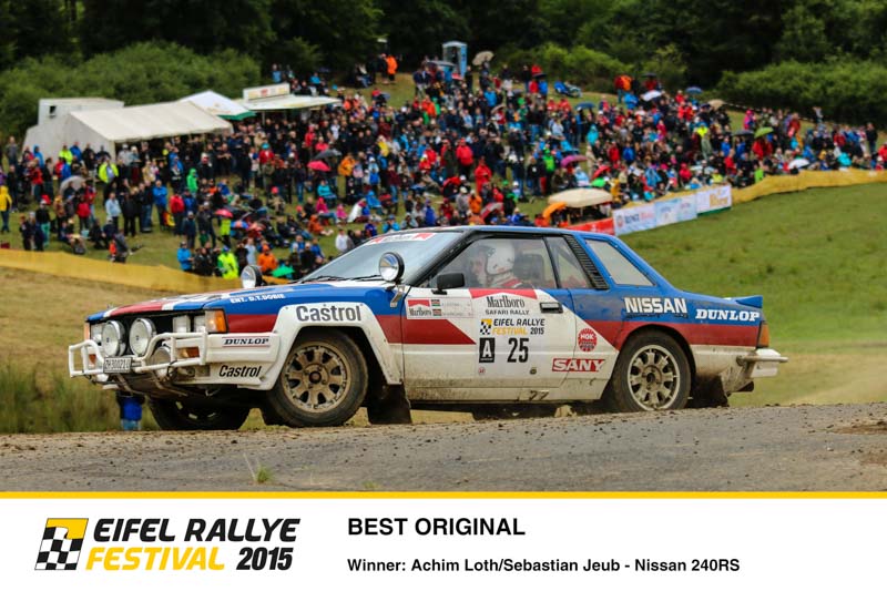 Kernstück des Eifel Rallye Festivals ist es, dass es keinerlei Zeitwertung gibt. Mit den historischen Rallye-Boliden wurden reine Demonstrationsfahrten absolviert. Dennoch gab es bei der Rallye-Party am Samstagabend Siegerehrungen. Experten-Juries wählten die Sieger in den verschiedenen Kategorien. Als „Best original rally car“ (schönstes Original) wurde der Nissan 240RS, pilotiert von Achim Loth und Sebastian Jeub, geehrt. Dieses Auto schaffte die Rückverwandlung von absoluter Schrottreife in Afrika in den Originalzustand. Die Auszeichnung als „Best replication“ (schönster Nachbau) ging an den Fiat 131 Abarth, den sich Walter Röhrl und Timo Salonen teilten. Es ist ein kompletter Neubau, bei der Umwandlung in eine originalgetreue Kopie des ehemaligen Werkswagens mussten viele Teile von Rallysport Development im Norden Englands selbst hergestellt werden. Der erste Titel als „Rallying Ambassador“ (Botschafter des Rallyesports) ging an Helmut Deimel. Der österreichische Kultfilmer wurde für seine herausragenden filmischen Dokumentationen des Rallye-Sports ausgezeichnet. Eine ganz besondere Auszeichnung gab es durch die fünf anwesenden Champions. Mit der „Champion’s Choice“ ehrten Röhrl, Munari, Mikkola, Blomqvist und Salonen den original Lancia Stratos, das Siegerauto der Rallye Monte Carlo 1977 als ihr Lieblingsauto des Festivals 2015. Darüber hinaus wurde der Oldtimer-Markt-Durchhalte-Pokal an Friedhelm und Julian Pinnen vergeben. Bei dem Sprung auf der Bosch Super Stage zerbarst die Lenkung an ihrem Talbot Sunbeam Lotus. Über Nacht wurde eine neue Lenkung aus Duisburg organisiert, nach Daun gebracht und rechtzeitig zum Start der Samstagsetappe wieder eingebaut. Enda Garvey und Co-Pilotin Jennifer Lerch hätten hingegen auf die Auszeichnung mit dem Pechvogel-Pokal gerne verzichtet. Ihr Peugeot 405 Pikes Peak, der nur bei der Festival-Parade teilnehmen sollten, blieb schon am Start mit technischen Defekten liegen, zudem war der extra aus Irland angereiste Garvey gesundheitlich angeschlagen.